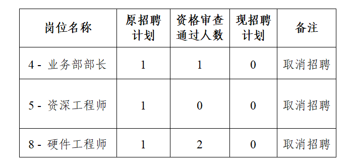 根据《合肥市医疗器械检验检测中心有限公司2025年下半年社会招聘公告》规定,参加测评人数与招聘岗位录用计划数的比例达不到3:1的,相应取消该岗位招聘计划数。结合实际报名及资格审查情况,经研究决定取消本次部分岗位招聘计划数,具体如下: