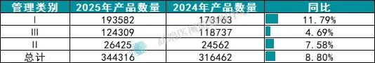 2021-2025 年,产品数量从 252505 件增至 344316 件,连续五年扩容。增速呈阶段性波动:2021-2022 年保持 13%+ 高增,2023 年回落至 3.93%,2024-2025 年回升至 6.35%、8.80%,回归稳健增长。