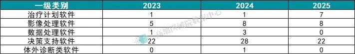 治疗计划软件增长最突出:从2023-2024 年的 1 件,跃升至 2025 年的 7 件,实现量级突破;